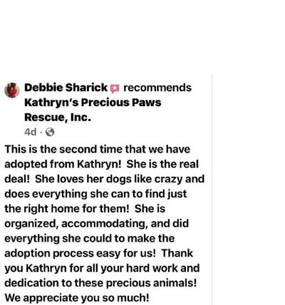 As lifelong animal caregivers our mission is to encourage others to find love and companionship with dogs and cats that have been neglected and/or abandoned. Kathryn’s Precious Paws Rescue is going to help such animals with the assistance of our volunteer foster care associates. We will carefully heal their wounds both physical and emotional. These animals will then be ready to return love to their new forever companions. KPP Rescue will carefully pair the animal with new families. It is VERY IMPORTANT to us to create a healthy happy bond.